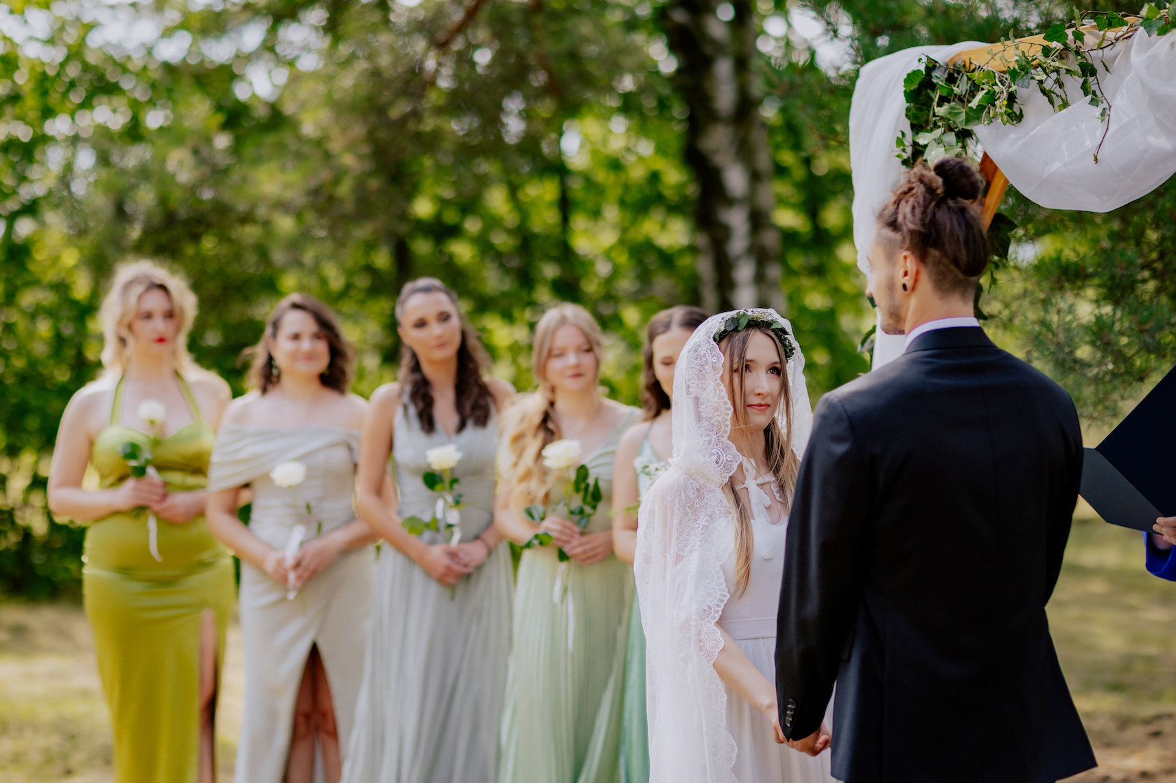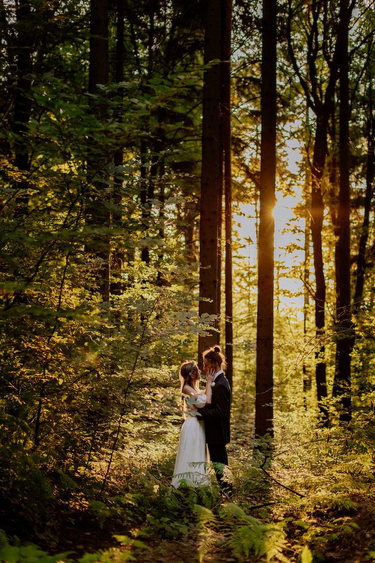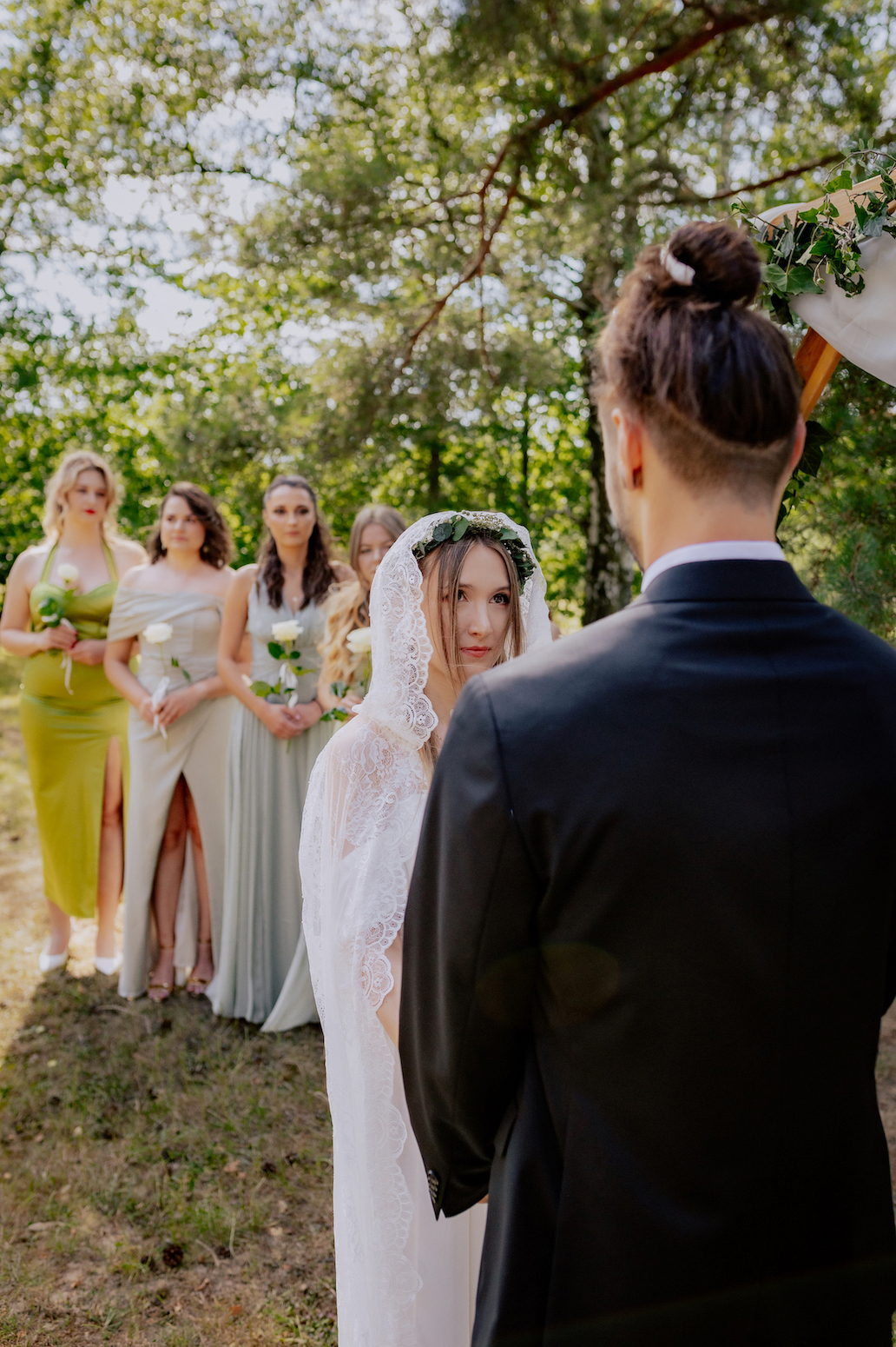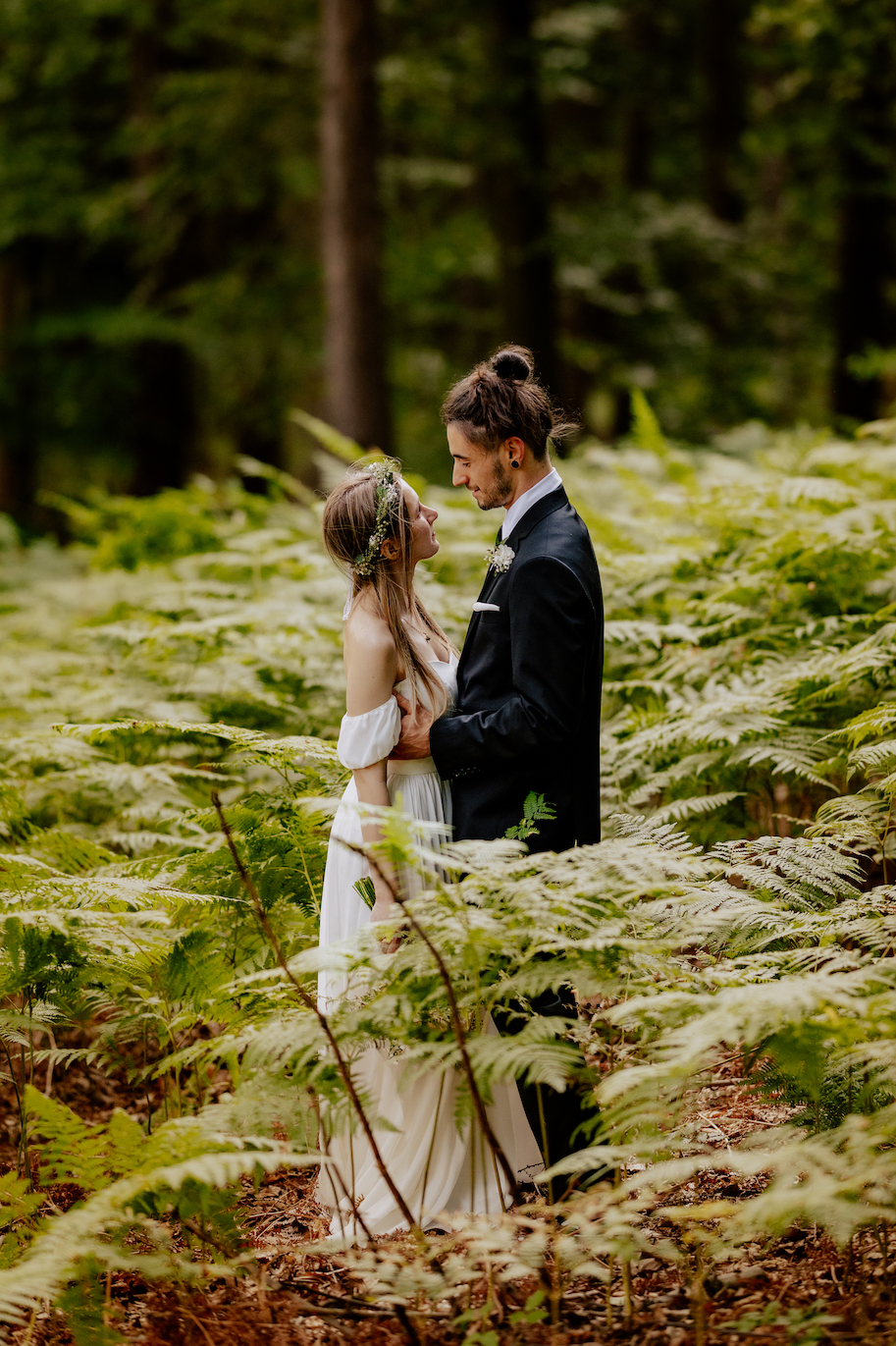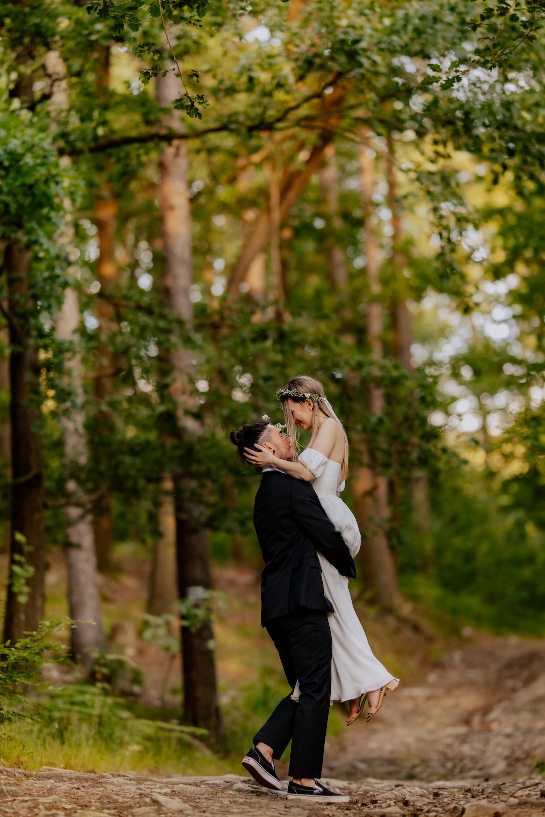 Fotografia ślubna w Mieszko i Jagienka to magia. Miejsce pełne uroku. To tu odbył się ślub Mai i Marcina, esencja natury i spontaniczności. Ceremonia w lesie, otoczona majestatycznymi drzewami i delikatnym śpiewem ptaków, była prawdziwie magiczna. Pośród lasu, przez który przebijało się naturalne światło uchwyciliśmy niezapomniane momenty pełne miłości, radości i autentyczności. Spacer pośród drzew, eksplorowanie lasu to była czysta przyjemność. Dodatkowo, za każdym zakrętem odnajdowaliśmy nowe miejsca na kolejne zdjęcia. Niesamowita polana pełna paproci skradła nasze serca. Dodatkowo, promienie słońca cały czas pomagały nam w chwytaniu kolejnych kadrów.